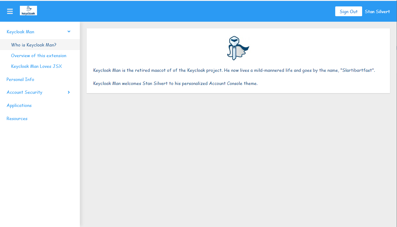 You may have noticed the "Keycloak Man" section above. The new console includes one of our most requested features. That is the ability to add and remove sub-pages. So we’ve made it very easy to develop and plug in your own React component and add it to the Account Console.