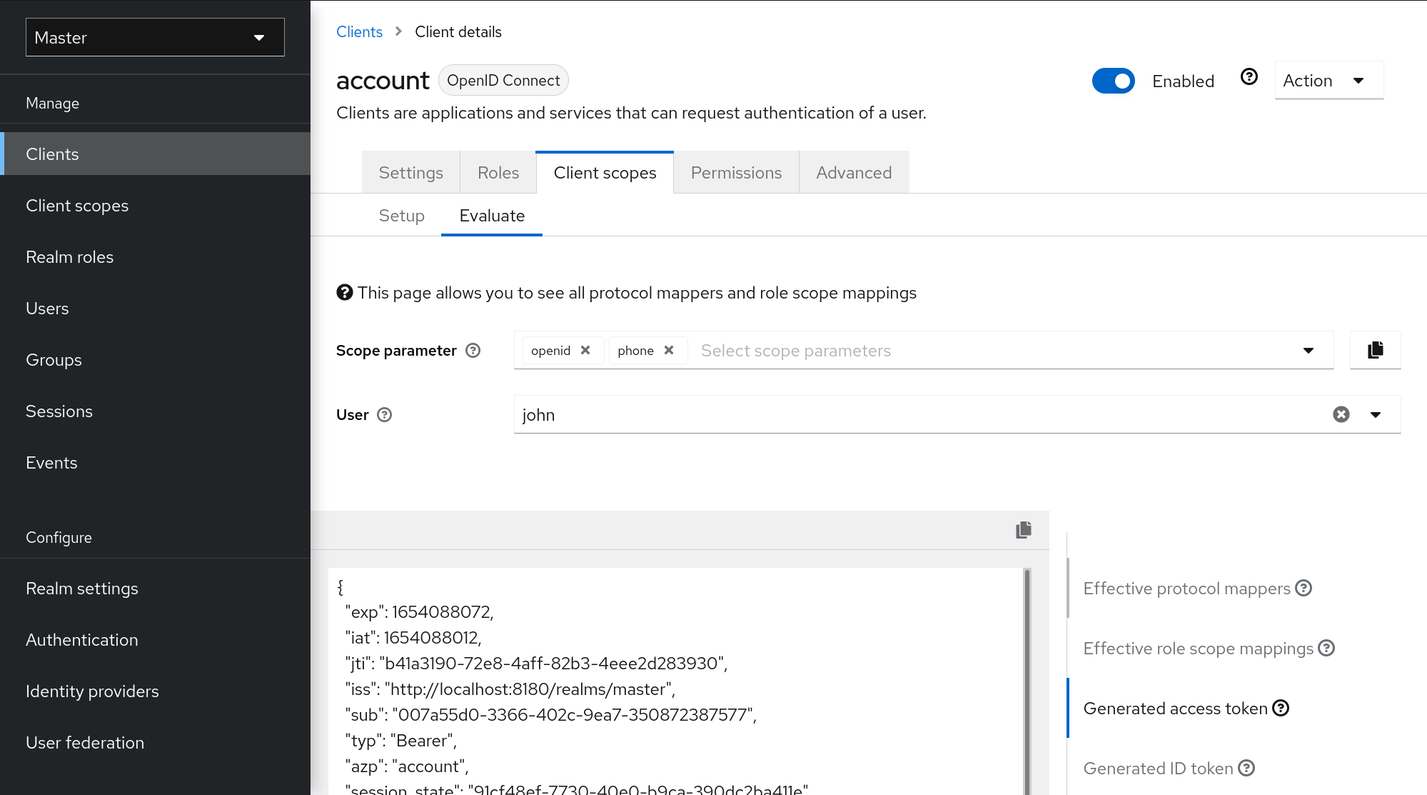 When a client is registered, you must define protocol mappers and role scope mappings for that client. It is often useful to store a client scope, to make creating new clients easier by sharing some common settings. This is also useful for requesting some claims or roles to be conditionally based on the value of